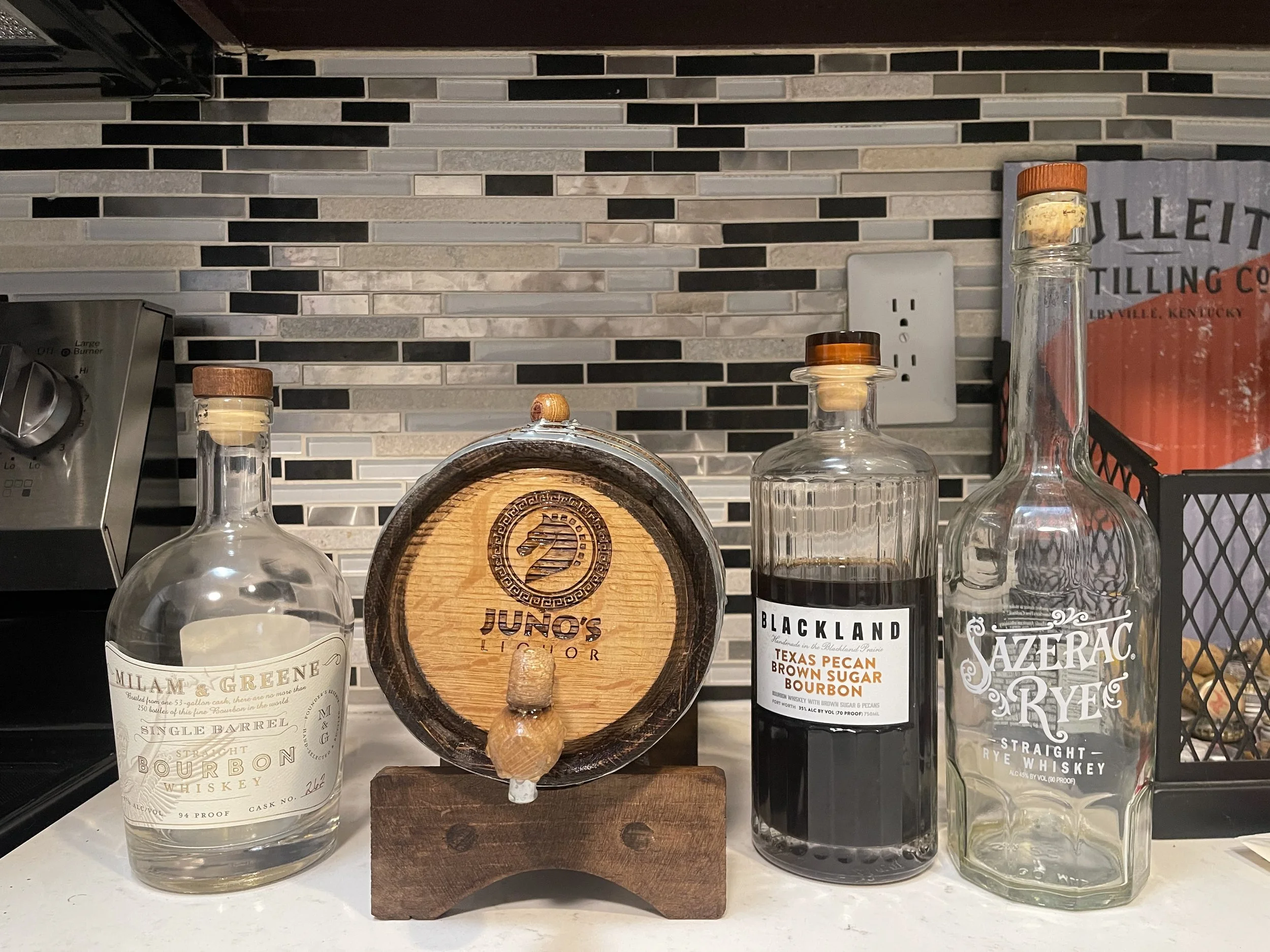 Hey ya’ll, Gideon here from the Las Colinas location. A few months ago we brought in some mini aging barrels as both a product and a rewards item for you all. It piqued my interest right away but I’ve finally decided to give it a go of trying to make my own blend using some of my favorite whiskeys. Below I will explain my process and how long I anticipate waiting before bring this pour to you all.